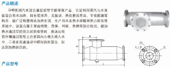 GHB系列汽水混合器是新型節(jié)能環(huán)保產(chǎn)品, 它是利用蒸汽與水直 接混合將水加熱,具有低噪聲、無振動,熱交換效率高,節(jié)省能源等 特點(diǎn)、被廣泛地使用在加熱生活、生產(chǎn)用水及熱水采