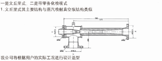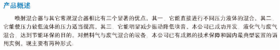 噴射混合器與其它常規(guī)混合器相比有三個顯著的優(yōu)點,其一它能直接進行不同壓力液體的混合,其二它能使壓力較低流體的壓力適當提高。其三,它能明顯減少振動降低噪音,本公司已成功開發(fā),液化氣與廢氣混合,達到節(jié)能環(huán)保的目的。對燃料氣與廢氣混合的設備。本公司已有成熟的技術保障和國內(nèi)最典型裝置的誚用實例?,F(xiàn)主要有兩種形式。